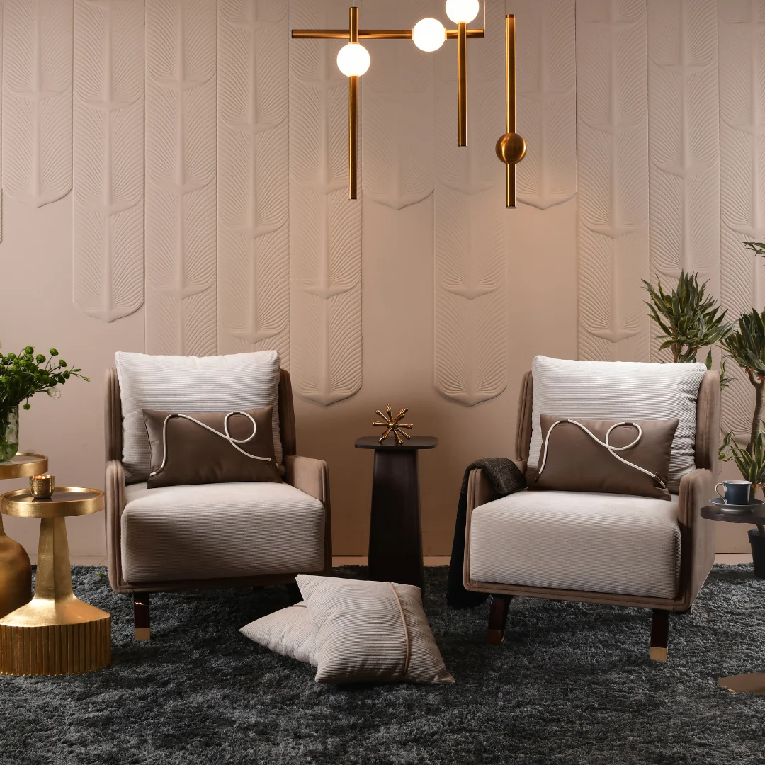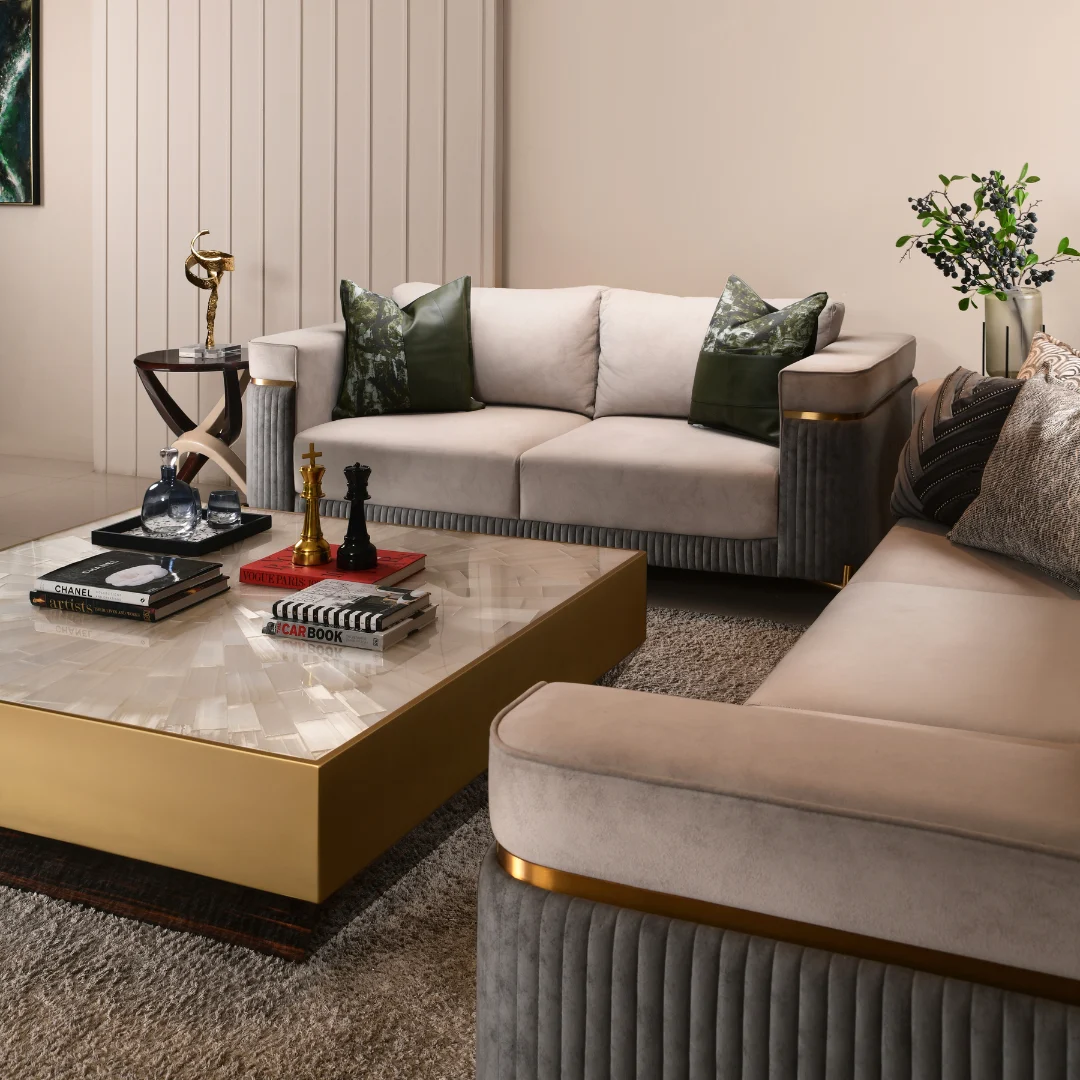 Defined by the idea of comfort and opulence, this living room sofa, by the top luxury sofa supplier in Delhi, is the epitome of craftsmanship and tailored lines. It echoes the poetry of precision, sculptural lines, and indulgent textures, curated to elevate the idea of modern living.